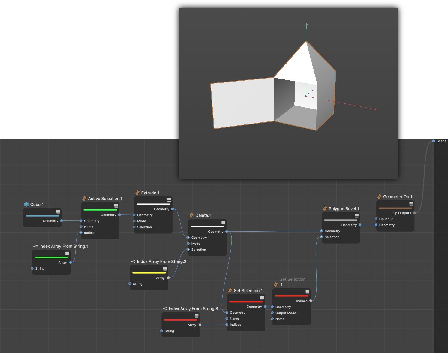 Sin embargo, el Index Array de Text Node se puede utilizar en ambos casos para definir los índices de los puntos o polígonos. Se puede utilizar un nodo de selección activa para generar una selección guardada (a través de Establecer nodo de selección) o para seleccionar directamente índices de entrada en la geometría.
