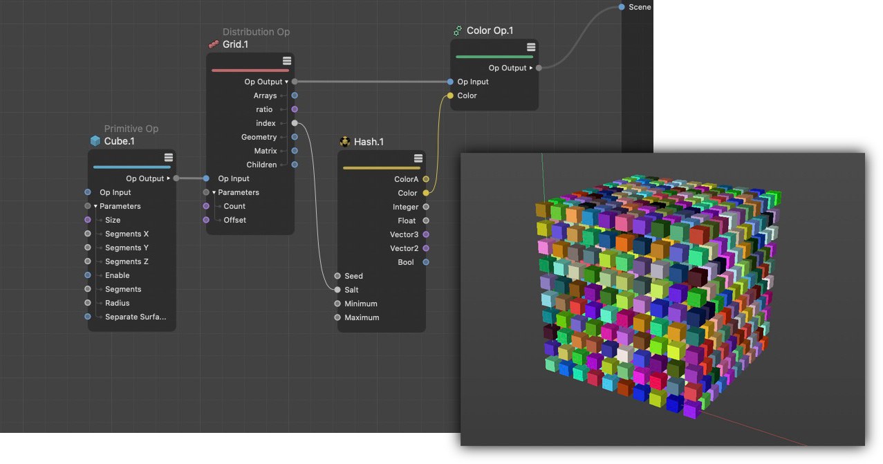 Si desea duplicar objetos, puede, por ejemplo, usar un nodo de operación de distribución, que se puede usar de manera similar al objeto MoGraph Cloner. Un objeto vinculado se clonará en las posiciones definidas y luego se puede enviar directamente a la escena. El nodo Color Op se puede utilizar para colorear estos clones individualmente. En la imagen de ejemplo a continuación, se usó un nodo Hash para generar colores aleatoriamente.