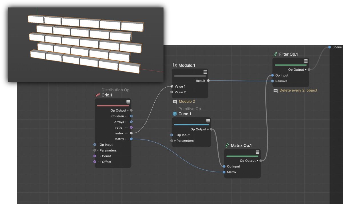 En este ejemplo, también verá cómo se pueden eliminar los objetos de una distribución. Aquí, un módulo matemático con un valor de 2 para los números de índice de los clones se usa para entregar solo resultados entre 0 y 1. Estos valores se pueden interpretar como valores booleanos a través de un nodo de operación de filtro, que dará como resultado cada otro objeto se elimina automáticamente. El resultado será un patrón típico de colmena o ladrillo.