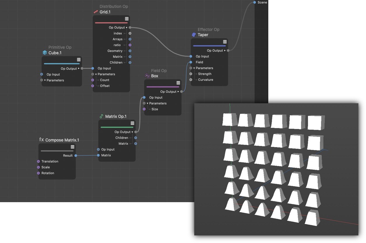 Por supuesto, la posición y la forma de las copias que se crean se pueden modificar. Hay varios efectores disponibles con los que se puede hacer esto. El nodo Effector Op ofrece una amplia gama de deformaciones comunes como abultamiento, conicidad, torsión y flexión. También puede crear algoritmos personalizados a través de un nodo de grupo Effector. Los campos separados, que se pueden seleccionar a través de un nodo de operación de campo, se pueden usar para restringir espacialmente el efecto de la deformación n: