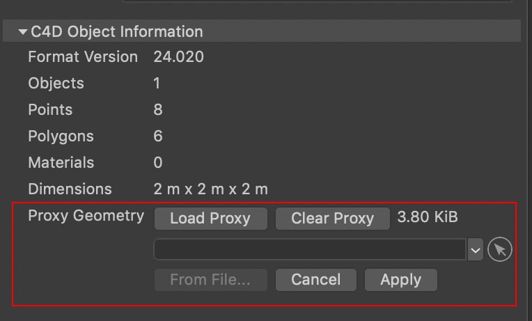 Si desea definir una geometría de proxy, haga clic en el botón Editar proxy. En la ventana de diálogo que se abre, puede seleccionar un objeto del Administrador de objetos para aplicar (luego haga clic en el botón Aplicar) o puede cargar un archivo. Hecho.