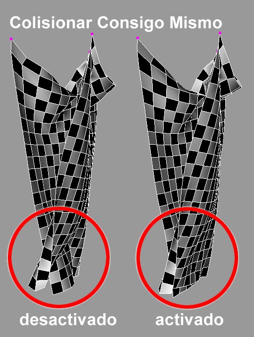 Esta opción permitirá que el objeto tela colisione contra sus propios puntos. Esto evita que la tela penetre en su propia superficie cuando la simulación se reproduce. Debido a la cantidad de cálculos que deben realizarse cuando esta opción está activada, puede producirse que la reproducción en el panel de vista se ralentice. Cuando se aplican fuerzas extremas al objeto tela, todavía pueden producirse intersecciones debido a esas fuerzas extremas. Usar Repelerse a Sí Mismo (pestaña Fuerzas) junto con, o en vez de esto, ayudará a evitar intersecciones en la ropa.