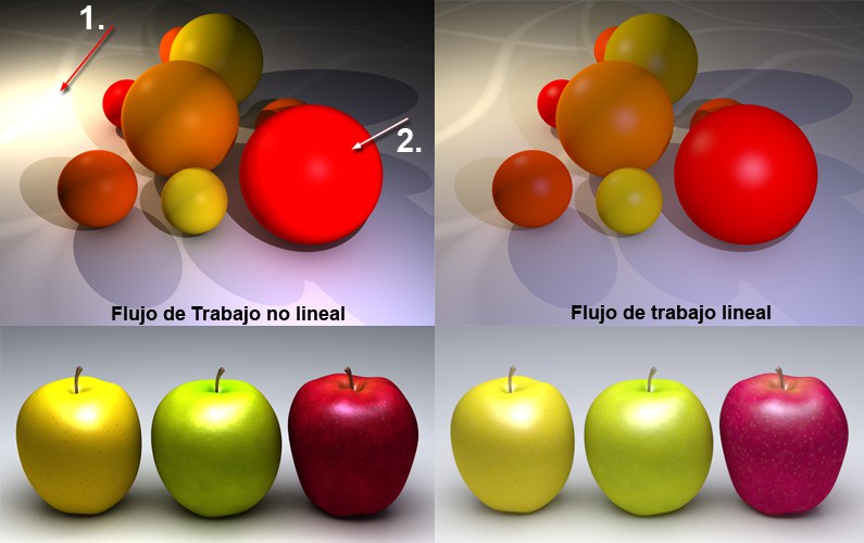 Por otro lado los renderizadores (incluyendo el renderizador de Cinema 4D) funcionan internamente con rangos de gama lineales (es decir, gama = 1; definido por los algoritmos vigentes) y esperan lo mismo de los elementos que muestran (texturas, shaders, etc.). Sin embargo, esto no era tan sencillo en el pasado. El renderizador quiere un valor de gama de 1 pero usa con entradas con valores de gama de 2.2. Es normal que surjan discrepancias con un resultado físicamente correcto.