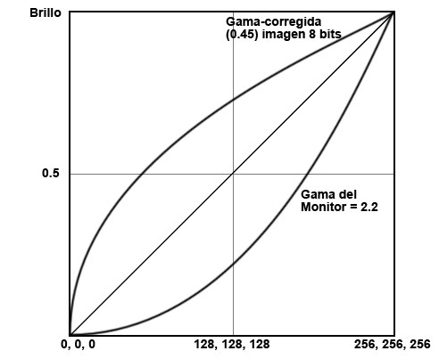 Una imagen de 8 bits con gama corregida con un valor de gama de 0.45 se muestra en un monitor (gama = 2.2) con un rango de brillo (para el ojo humano) lineal.