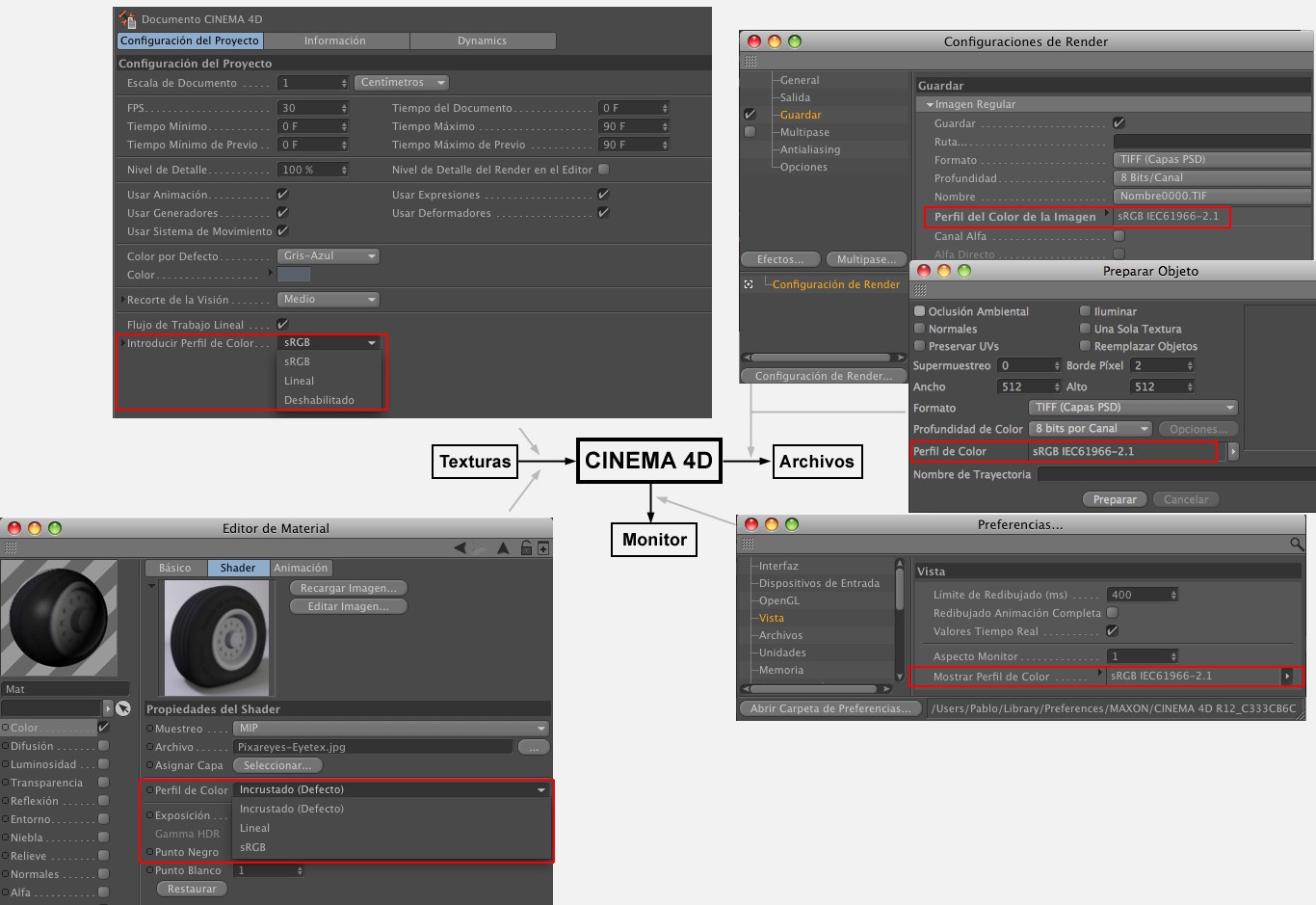 Los sitios dentro de Cinema 4D donde pueden definirse perfiles de color se listan abajo.