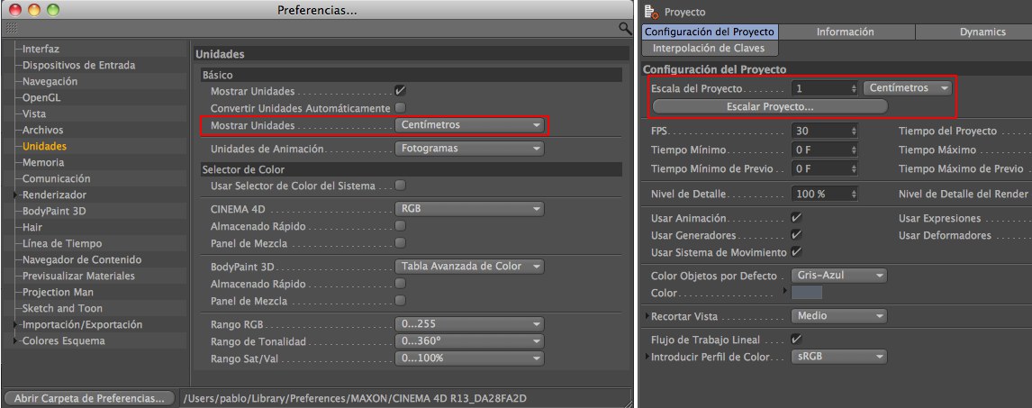 Puedes definir unidades de medida dentro de Cinema 4D en estos lugares: