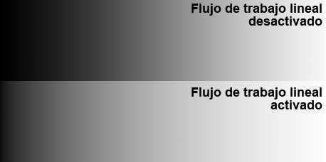 El valor de color de 128, 128, 128 en el centro de un gradiente en escala de grises (opción Flujo de Trabajo Lineal desactivada) cambiará aproximadamente a 192, 192, 192 al activar esta opción. ¡Este comportamiento es correcto!.
