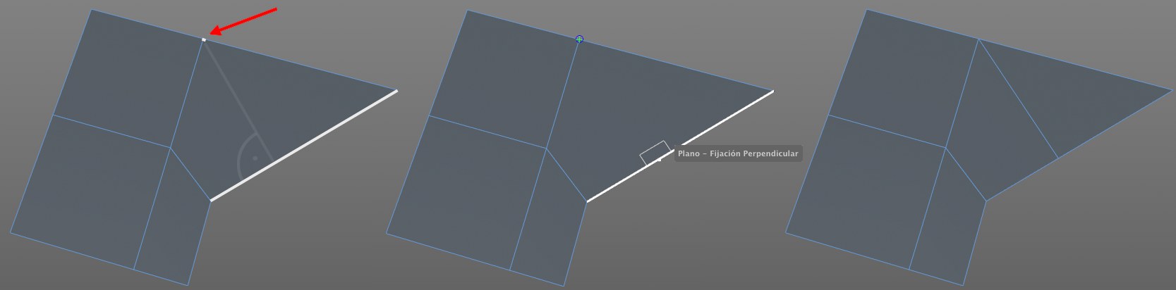 Usa la fijación Perpendicular para realizar fijaciones sobre líneas perpendiculares a otra línea (Guías o aristas de polígonos). Esta es una de las opciones de Fijación más importantes. Esta opción es un poco más complicada de entender pero puede resultar muy útil. Si se usa correctamente pueden realizarse fijaciones incluso sin usar las vistas ortográficas al modelar. Echa un vistazo a los siguientes ejemplos. Puede que te ayuden a comprenderlo.