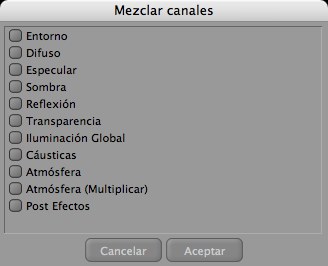 Crea una capa mezclada. Por ejemplo, puedes mezclar Sombra, Iluminación Global y Cáusticas de Fotones en una sola capa. Después de elegir este comando, se abrirá un diálogo. Activa los canales que deseas mezclar y haz click en Aceptar.