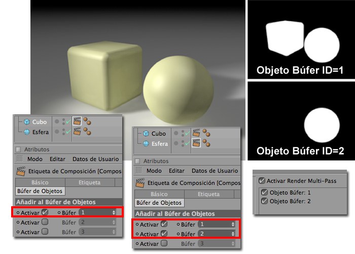 La esfera aparece en ambos Búfers de Objetos porque la etiqueta Composición tiene dos IDs (ID=1 and ID=2)