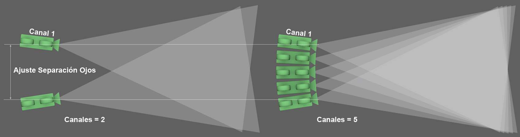Si se selecciona esta opción, puede definirse el canal que debe renderizarse. 1 siempre renderiza la vista del ojo izquierdo y el valor definido para Canales será la vista del ojo derecho. Valores intermedios representan vistas de cámara intermedias, como se describe en Posicionamiento.