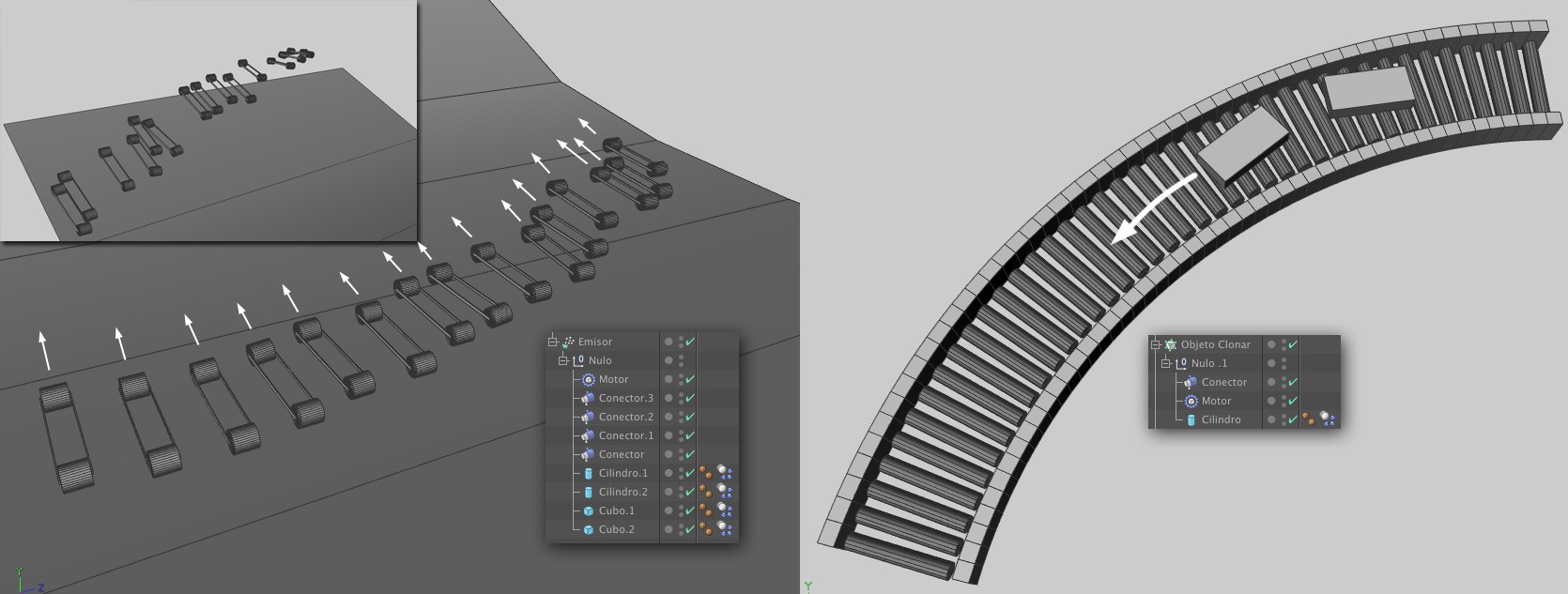 A la izquierda de la imagen anterior se ha equipado un vehículo con un Motor y se ha hecho a toda la construcción hija de un Emisor. El Emisor libera al vehículo de modo que puede circular por los alrededores independientemente. A la derecha hay un simple cilindro, también propulsado con un Motor y clonado en forma curva usando un objeto Clonador. El resultado es un transporte funcional.