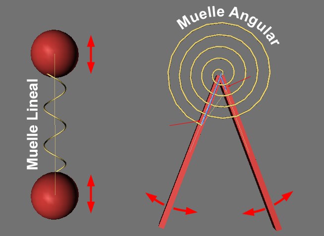 Los muelles son elementos que ejercen una fuerza que se incrementa según su distorsión. Los muelles tienen una longitud dada en su estado de reposo (una rotación dada para muelles angulares) en la que no se ejerce ninguna fuerza. En cuanto se altera la longitud o rotación de un muelle, se ejerce una fuerza que trata de llevar al muelle a su estado de reposo. Se produce un movimiento de muelle como resultado de la inercia de masa de un objeto enlazado al muelle que hace que el muelle se extienda o comprima más allá de su estado de reposo.