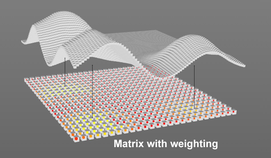 Aquí una Matriz (3 Campos Esféricos definen la ponderación) afecta a una segunda Matriz a través de una capa de objeto MoGraph.