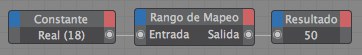 Este nodo remapea un valor de un rango a otro. Por ejemplo, supongamos que la altura de un objeto debe controlar el brillo de una luz usando una Clave de Asignación de Control. Cuando el objeto tiene una altura de 0 m, el brillo de la luz debe ser del 0%. Cuando el objeto tiene una altura de 2 m, el brillo debe ser del 100%. Usando el nodo Rango de Mapeo, podemos remapear la altura del objeto del rango 0 a 2 m al rango 0 a 100%. En este caso, una altura de 1.5 m se remapeará a 75%.