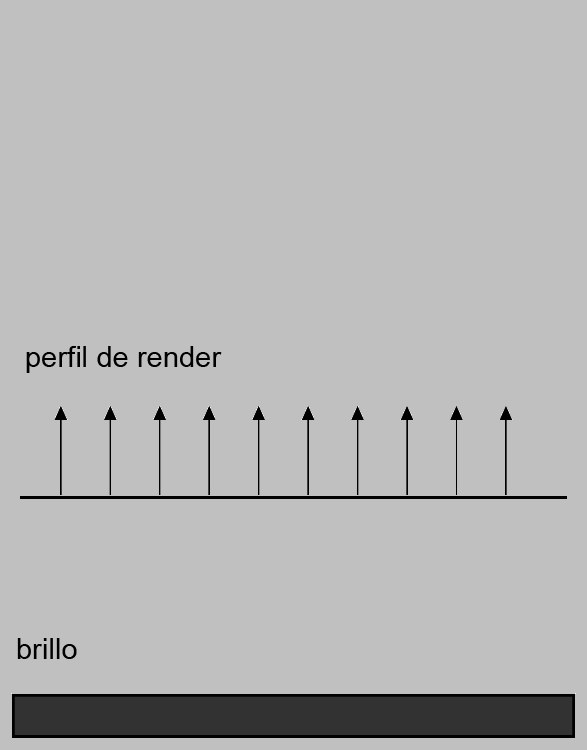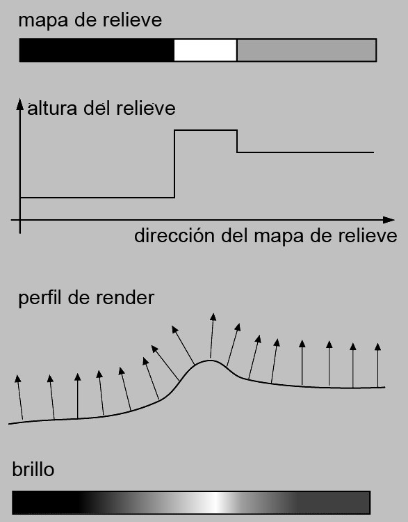 Esos valores de altura se convierten en un perfil, cuya altura afecta a la inclinación de los vectores de la normal. Aunque la superficie es actualmente lisa, mediante un cambio en los vectores de la normal, a la hora de renderizar se crea una superficie aparentemente en tres dimensiones con una estructura en relieve.