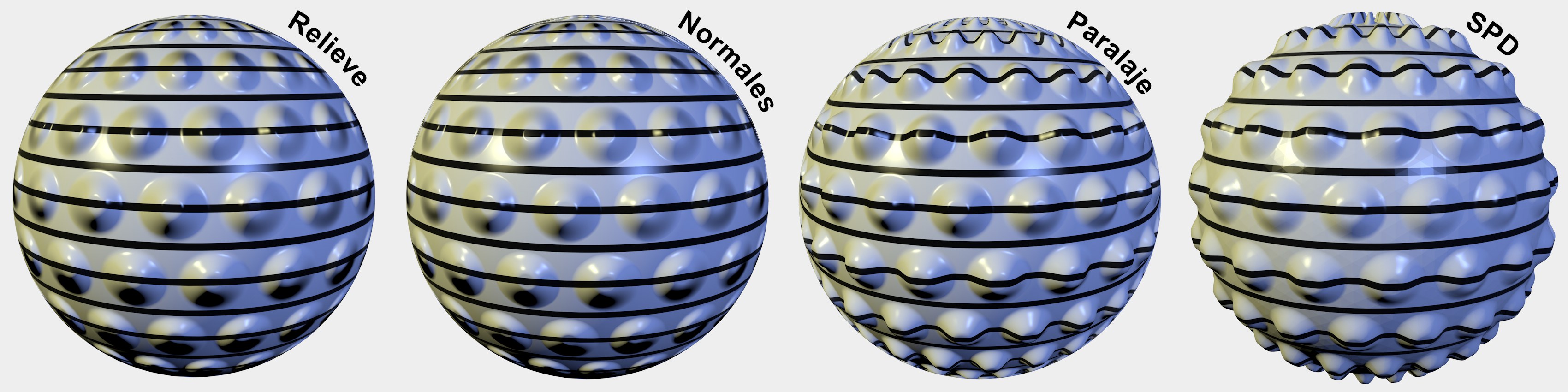 Los siguientes métodos están disponibles, se ordenan de forma ascendente con respecto al tiempo de render / calidad (de los cuales los dos primeros usan trucos de render y el desplazamiento subpoligonal eleva/hunde la superficie de verdad, lo que ofrece los resultados más realistas):