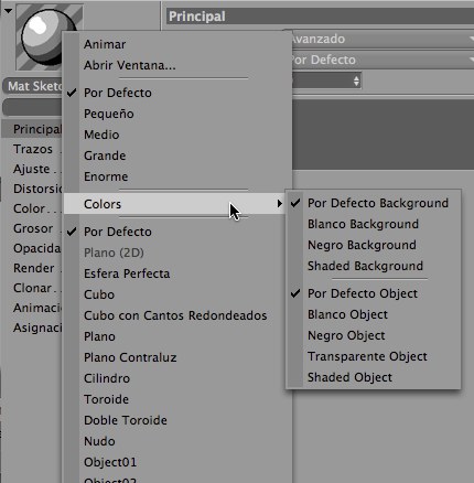 El material Sketch usa todas las opciones estándar de previsualización de Cinema 4D, más varias propias de Sketch and Toon. Para acceder a esas opciones, haz click derecho (Windows) o click-Comando (Mac OS) en el previo. Las opciones Fondo Sombreado y Objeto Sombreado usan el sombreado del post efecto para el fondo u objeto.