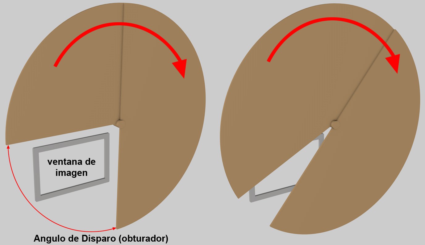 Un obturador rotatorio normalmente rota 24 veces por segundo. A la izquierda un ángulo de obturación grande (= más tiempo de exposición), a la derecha un ángulo de rotación pequeño (= menos tiempo de exposición).