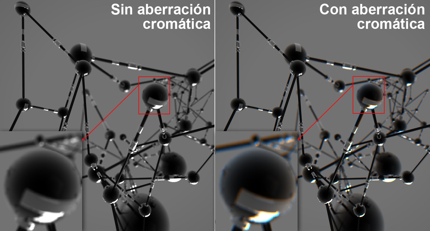 Las aberraciones cromáticas suceden en las lentes cuando se refractan componentes de la luz de distintos colores (dependiendo de la longitud de onda) con intensidades variables. En la imagen anterior, no se aprecia este efecto debido a las costuras coloreadas de azul-rojo en las regiones de alto contraste. Las aberraciones cromáticas sólo se manifiestan en las regiones de la imagen desenfocadas, es decir, si no hay desenfoque, no aparecerán aberraciones cromáticas.