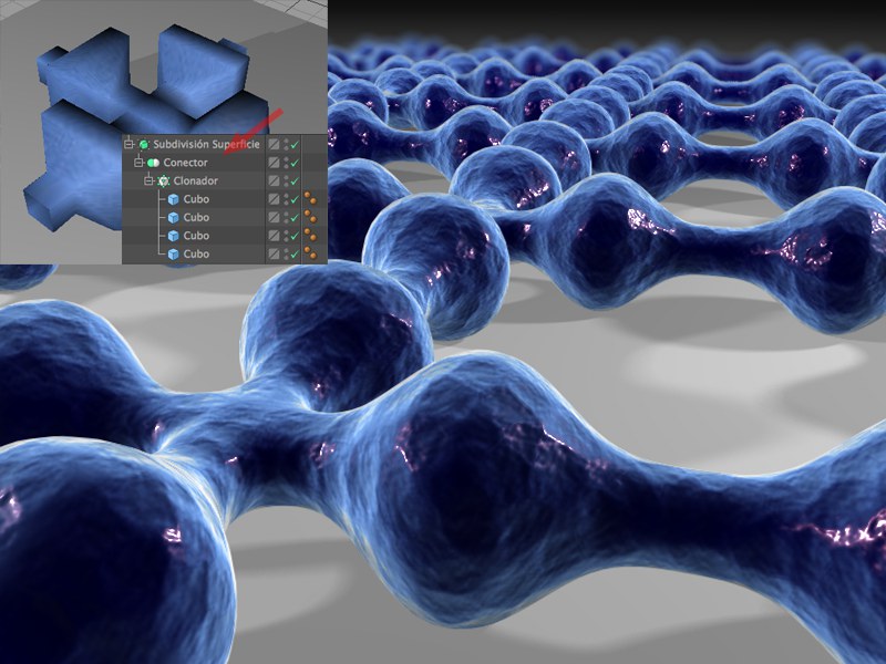 El Objeto Conector se ha usado junto al Objeto Clonar de MoGraph para crear esta imagen. El objeto Subdivisión Superficie puede usarse para suavizar las conexiones uniformemente.