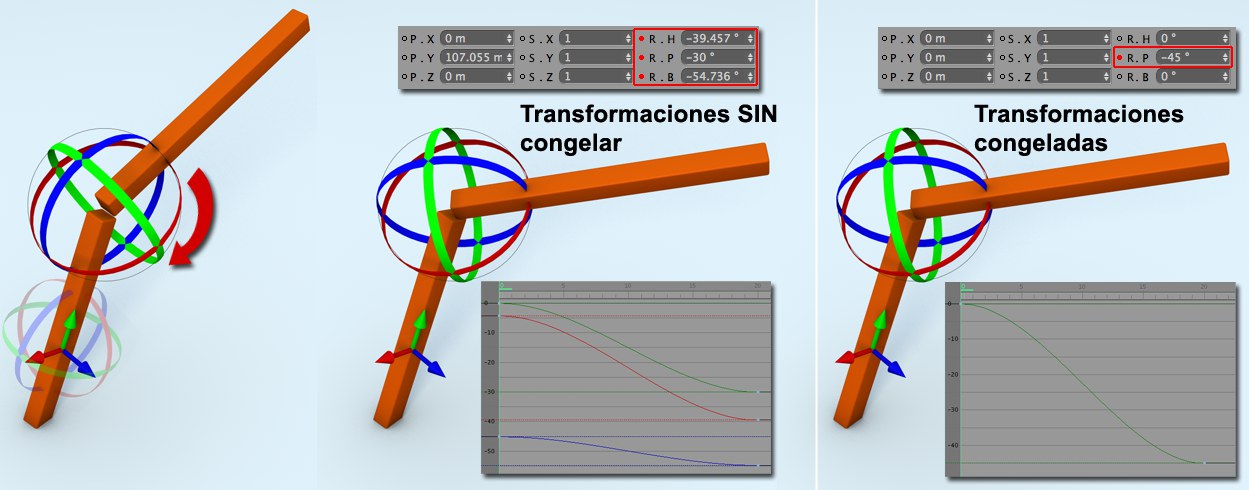 Todos esos efectos adversos pueden evitarse congelando la transformación ANTES de animar. Esto copiará los valores de Posición, Escala y Rotación a los valores subordinados con el mismo nombre y establecerá los valores iniciales de nuevo a 0 y 1, respectivamente.