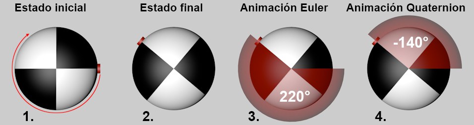 Podrías preguntarte por qué una animación Quaternion no es, en principio, aplicada a todos los objetos. La razón es que la interpolación Quaternion también tiene desventajas. El Quaternion funciona bien siempre y cuando el cambio en la rotación sea inferior a 180°. Más allá de esto, los problemas pueden ocurrir debido al hecho de que el Quaternion buscará siempre el camino más corto posible.