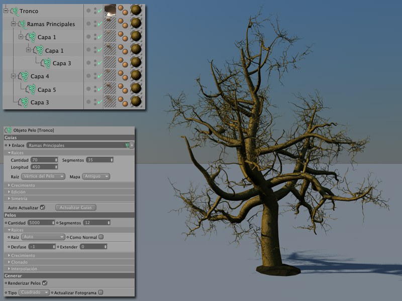 Las ramas en el ejemplo anterior son cada una Objetos Pelo individuales aumentando la cantidad de Guías y Pelos. Para crear las ramas retorcidas más pequeñas se ha usado el canal Encrespar.