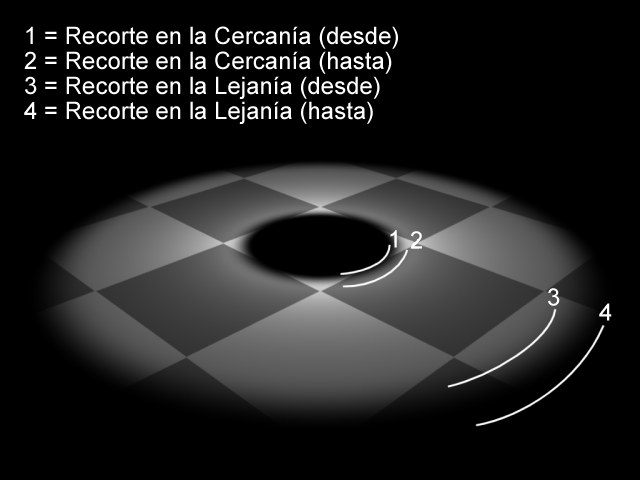 Rangos de recorte independientes usando una luz Omni. 1 = Recorte en la Cercanía (Desde); 2 = Recorte en la Cercanía (Hasta); 3 = Recorte en la Lejanía (Desde); 4 = Recorte en la Lejanía (Hasta).