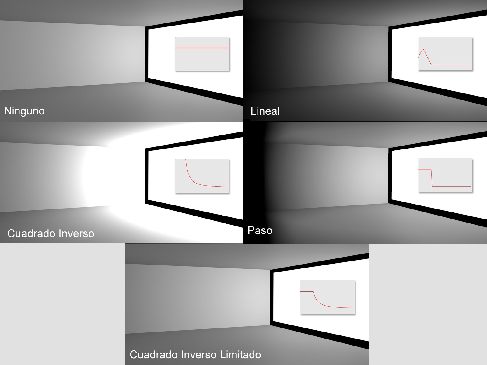 - Desvanecimiento Cuadrado Inverso y Inverso Ajustado: La Intensidad definida en la pestaña General se alcanzará en (o hasta) esta distancia desde el origen de la luz. A continuación la Intensidad disminuirá proporcionalmente de forma inversa al cuadrado de la distancia original.