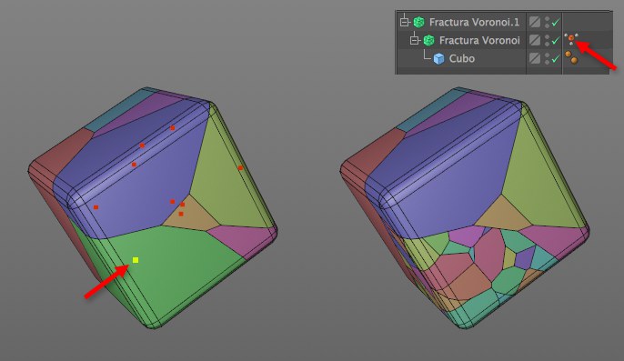 El fragmento verde pertenece a una selección MoGraph y se fragmentará aún más por Fractura Voronoi.1.