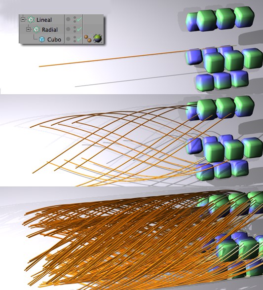 Los objetos o partículas (los vértices de los objetos también pueden conectarse, dependiendo del tipo de objeto trazado o de los modos de Manejar Clonadores) de distintos elementos trazados por el mismo Trazador se conectarán con una spline comín pero con distintos segmentos.