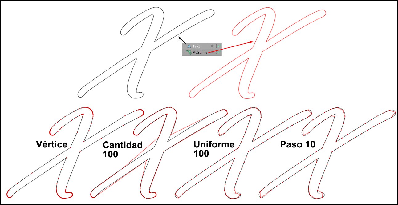 El Texto spline mostrado arriba a la izquierda es la spline de origen y es "copiada" por la MoSpline. Abajo hay varios modos de generación con ambas splines superpuestas.