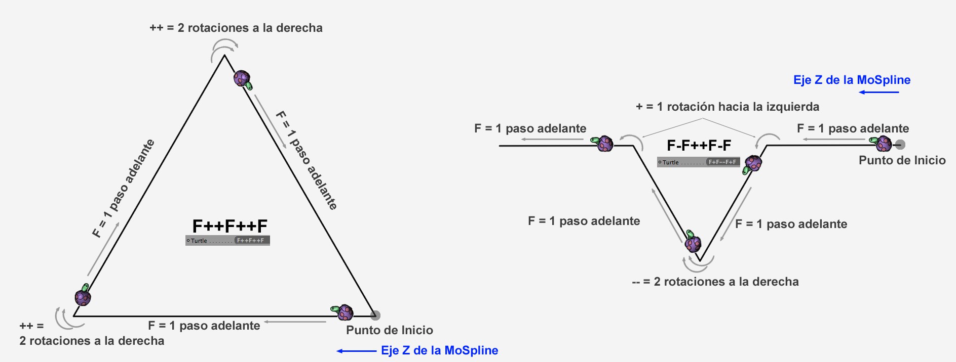 Si introduces la secuencia F++F++F en el campo Premisa se traduce a: "Ve un paso hacia adelante; gira dos veces a la derecha; ve otro paso adelante; gira dos veces a la derecha; ve otro paso adelante."