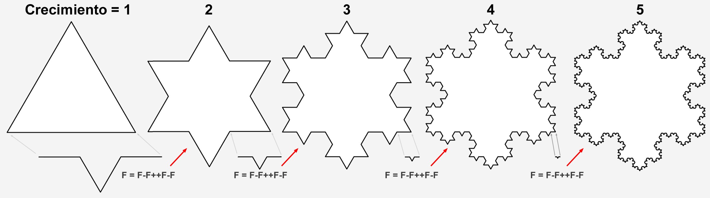 Dos códigos de comandos distintos: izquierda F++F++F; derecha: F-F++F-F (cada uno con un Ángulo por Defecto de 60°.