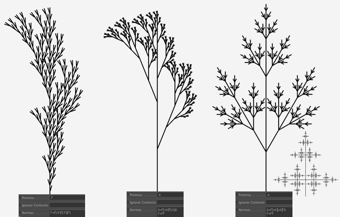 Esto permite crear formas tipo ramas. Una función muy interesante de los L-Systems es su sistema de reemplazo integrado con el que pueden reemplazarse ramas individuales por otras. Esto también puede hacerse de forma recursiva, lo que permite crear enramados muy complejos con simples códigos de comandos. Si esto suena confuso, el siguiente ejemplo puede resultar un poco más explicativo: