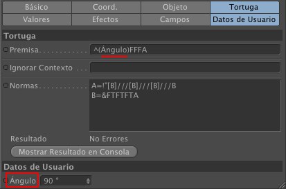 Puedes usar los Datos de Usuario como variables en una secuencia de símbolos. En la imagen anterior se ha añadido un parámetro Ángulo a los Datos de Usuario que luego se ha usado entre paréntesis con ^ (la tortuga rota alrededor del eje transversal) en el campo Premisa.