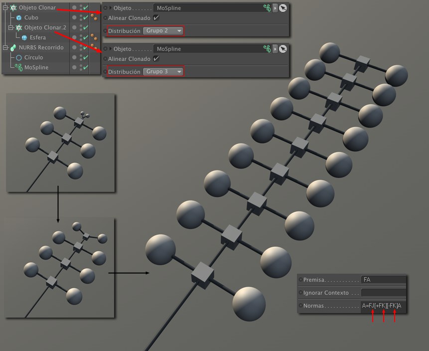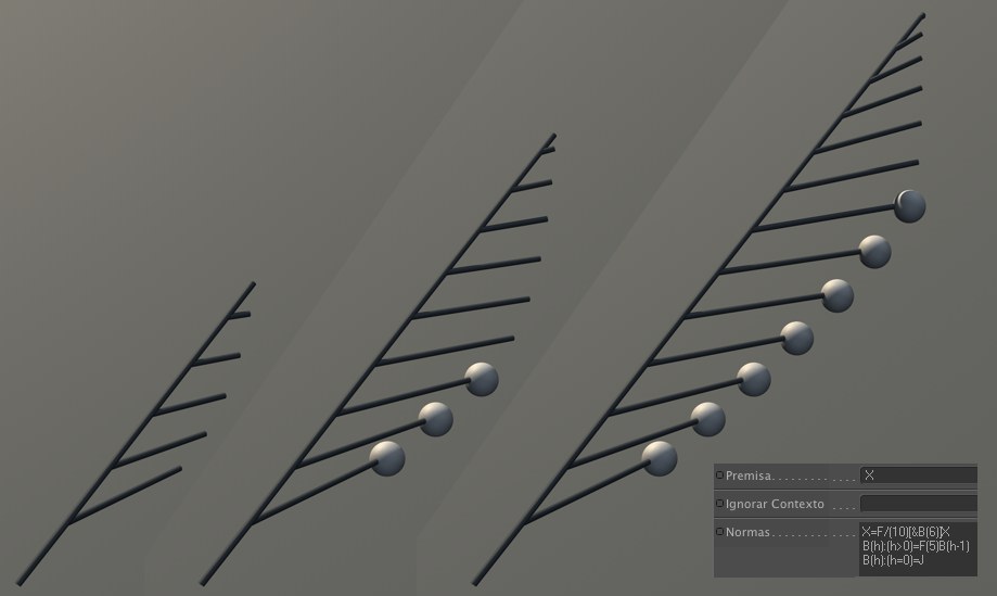 En este ejemplo, crecen simultáneamente varias ramas. Cuando una rama ha acabado de crecer, se colocará una esfera en el extremo de la rama (requiere el comando J, mira el ejemplo: Objeto Clonar).