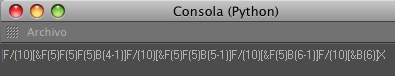 Haciendo click en este botón se mostrará en la Consola la secuencia de símbolos que está actuando actualmente, teniendo en cuenta todas las Normas y el parámetro Crecimiento. El aspecto de esa secuencia podría ser el siguiente (esta es la secuencia de símbolos del ejemplo de frutas con Crecimiento establecido a 4):