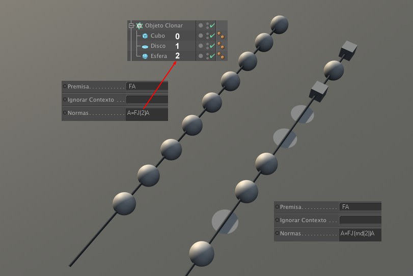 Los objetos Hijo de un objeto Clonar están numerados secuencialmente (comenzando en "0"). Si, por ejemplo, defines A=FJ(2,1,1,1)A (pueden omitirse los valores RGB), el objeto Clonar sólo usará el objeto con el índice "2" (a la izquierda de la esfera). Si usas A=J(rnd(2))A en el lado derecho, se colocará un clon aleatoriamente según un número entre "0" y "2" que también se elige aleatoriamente.