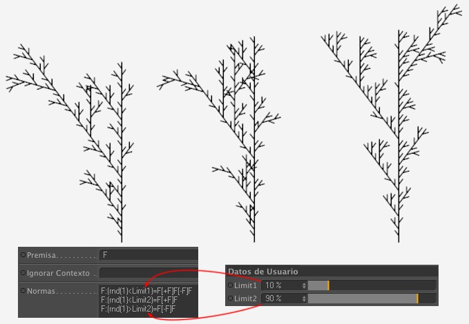 Esta Norma junto con varios valores de Datos de Usuario como Limit1 y Limit2 (juntos, esos valores equivalen al 100%) pueden usarse para crear "plantas" similares con variaciones (L-System Estocástico). Las condiciones (rnd(1)<) o (rnd(1)>) determinan aleatoriamente cuál de las 3 Normas se aplicará (se hace una nueva selección aleatoria en cada Generación nueva, es decir, con un valor de Crecimiento alto).
