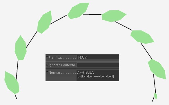 Entre las llaves (definen un polígono), se ha definido un número específico de puntos poligonales (cada uno comienza con un ".") entre los que se crea un polígono. Como las llaves están dentro de corchetes, la tortuga se restaurará al punto anterior a la creación de la hoja, después de que se haya creado cada hoja.