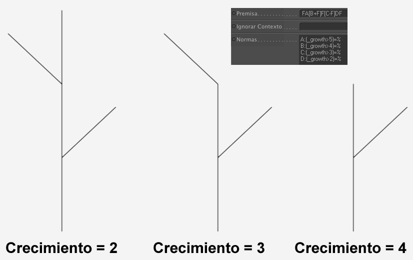 Si echas un vistazo a esta Norma, verás que los marcadores de posición A, B, C y D se han añadido a la premisa. Para varios valores de Crecimiento, las Normas ahora definen el reemplazo de cada marcador de posición con un valor en %, lo que significa que los siguientes símbolos se cortarán en ese punto en (y por) cada rama.