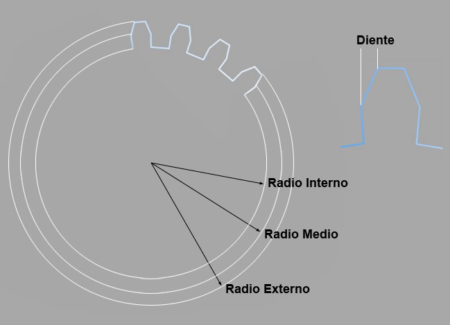 El tamaño total de la rueda dentada se define con Radio Externo, mientras que el Radio Interno define la profundidad de los dientes. Matemáticamente: profundidad de los dientes = (radio externo - radio interno).