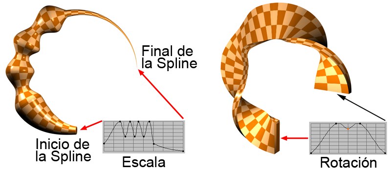 Si se activa esta opción, la spline rail puede usarse para alterar la escala del contorno a lo largo de la trayectoria. El factor de escala que se aplica a cada posición del contorno es igual a la distancia del vector que conecta el origen local del contorno con el punto correspondiente en la spline rail. Este vector conecta puntos de la spline de la trayectoria con sus correspondientes puntos de la spline rail y aplica una interpolación lineal para determinar los correspondientes puntos en la trayectoria de las splines situadas entre los puntos.
