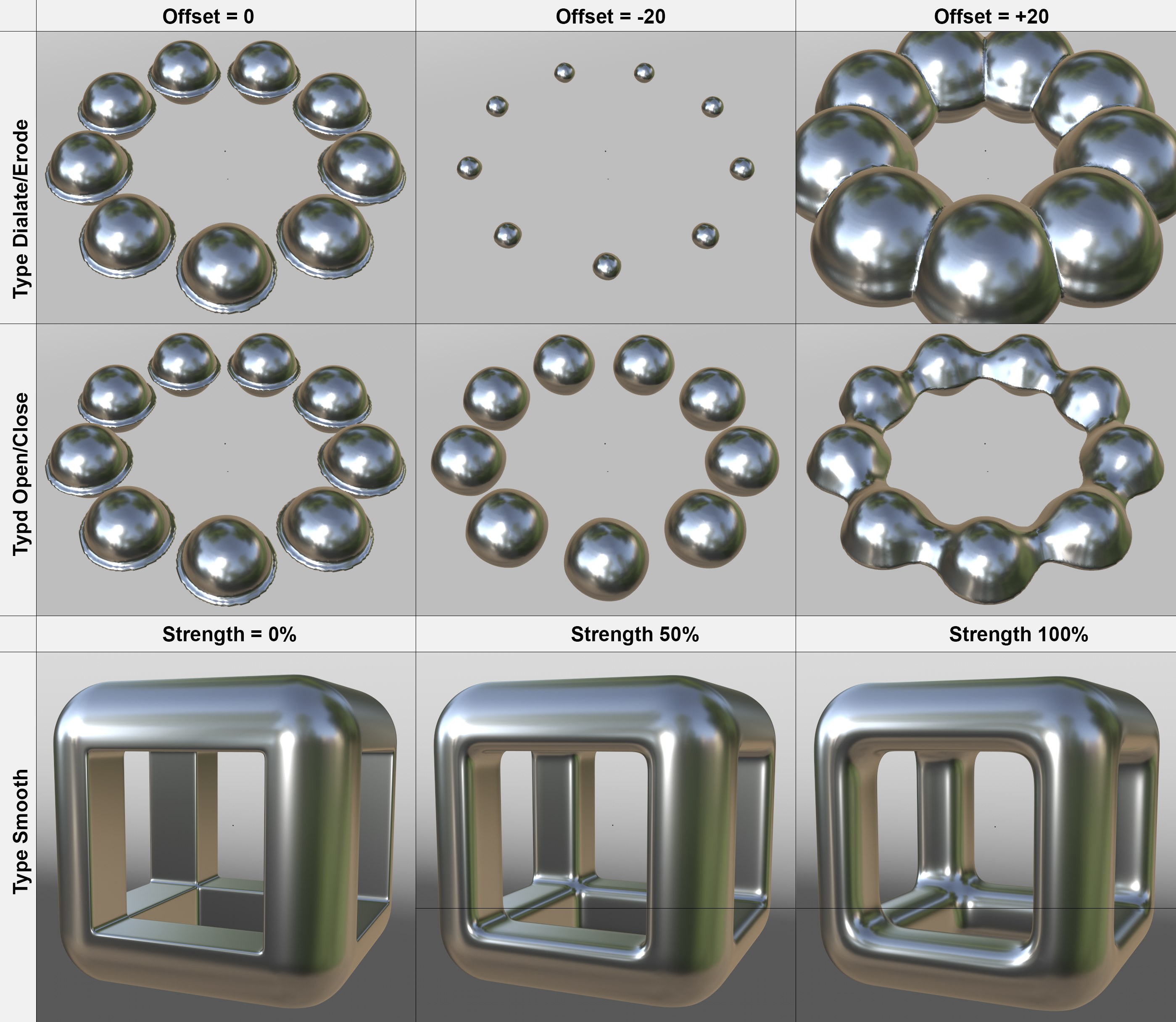 - Curvatura media (solo SDF): la curvatura promedio se determinará y aplicará en cada posición. La película de jabón, por ejemplo, se comporta así. Esto se puede usar para suavizar irregularidades menores.
