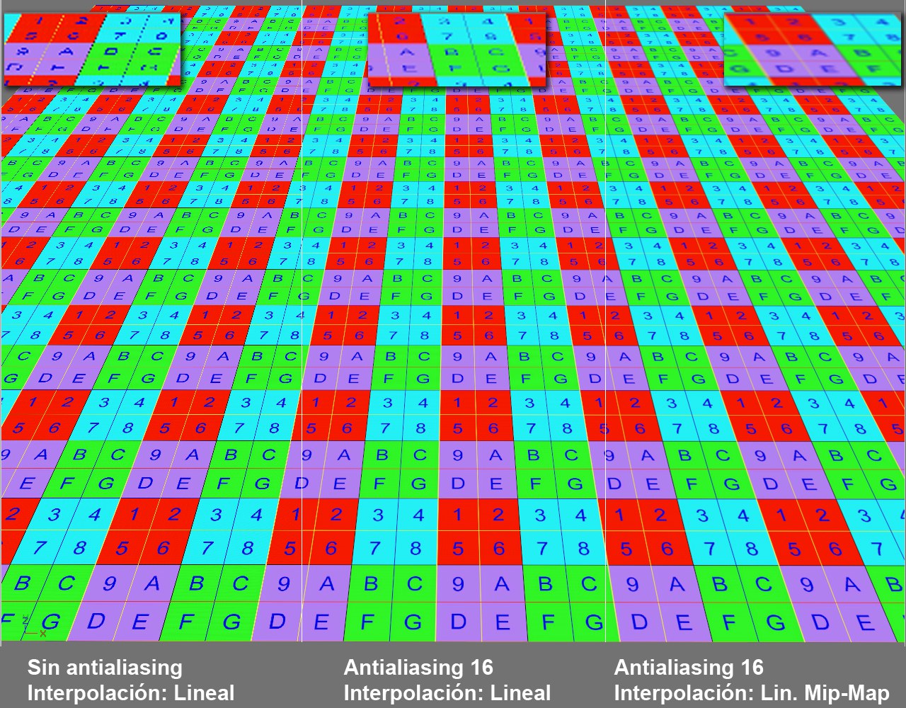 Textura Interpolada establecida a Cercana (arriba a la derecha) y a Lineal (abajo a la derecha).
