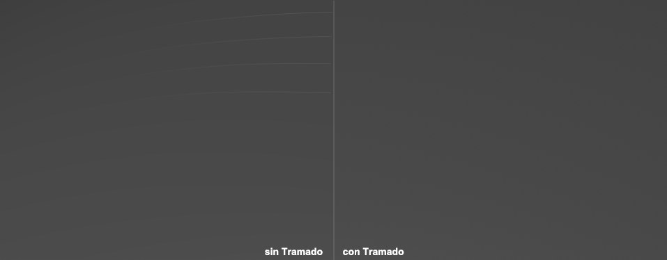 El banding puede ocurrir cuando se tienen gradaciones graduales en el brillo (en el ejemplo de arriba ocurre en la transición de RGB 69, 69, 69 a RGB 70, 70, 70). El tramado puede resolver visualmente transiciones duras de color.