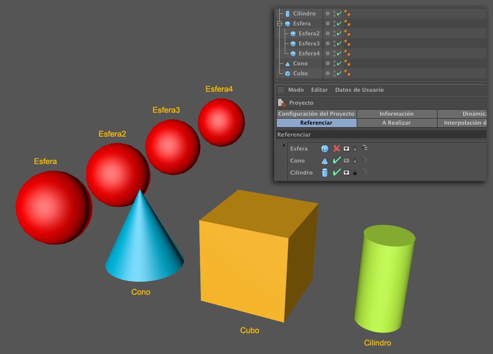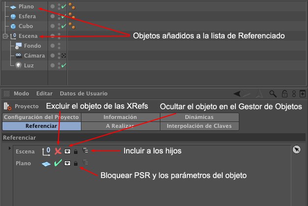 Aquí se ha creado un Proyecto referenciado y se han añadido varios objetos a la pestaña Referenciar de los Ajustes del Proyecto. En este ejemplo se ha excluido la esfera y sus hijos de las XRefs. Se ha excluido el cono en el Gestor de Objetos, pero todavía se importará en la escena por las XRefs.