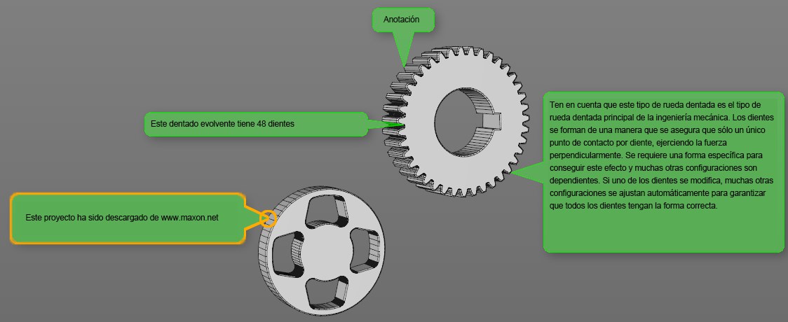 Campos de texto plegables pueden adjuntarse a los objetos usando la etiqueta Anotación. Cuando la vista es girada, estos campos de texto se recolocan de forma automática por lo que no tapan al objeto al que están unidos. Esto es muy útil para añadir comentarios específicos del objeto a los objetos de proyectos complejos.